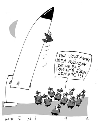 Depuis quelques jours, les choses empirent : j’ai un nouveau tic. Sur mon bureau, il y a une mallette fermée à clé avec des codes secrets. A certains moments, quand j’ai une crise, je l’ouvre dix fois par minute et je vois bien à la tête des généraux qu’ils aiment pas du tout quand je fais ça.